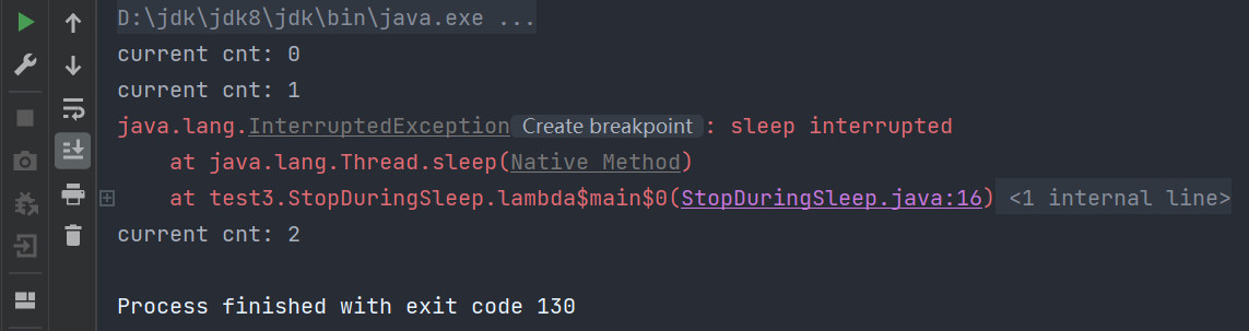 在上面的代码中,StopThread类的run()方法首先判断进程是否被中断,之后再判断cnt的值是否小于等于1000。线程的主要工作就是打印0~1000的数字。从最后的输出结果中也可以看到,线程并未完整的打印所有数字,这是因为在主线程中创建了子线程来执行这个任务,之后主线程休眠了2毫秒就使用interrupt方法对子线程打断,子线程的中断标志被置为true,同时在进入循环判断时就会因为标志位的改变而中断。