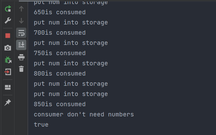 而对于消费者 Consumer,它与生产者共用同一个仓库 storage,并且在方法内通过 needMoreNum() 方法判断是否需要继续使用更多的数字,刚才生产者生产了一些 50 的倍数供消费者使用,消费者是否继续使用数字的判断条件是产生一个随机数并与 0.97 进行比较,大于 0.97 就不再继续使用数字。