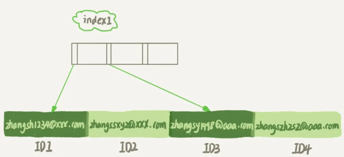 如果使用的是index1 (即email整个字符串的索引结构),执行顺序是这样的:
