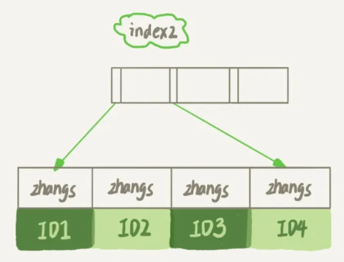 - 从index2索引树找到满足索引值是’zhangs’的记录,找到的第一个是ID1;