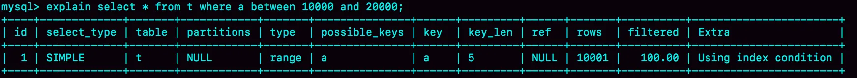 然后执行这样一条SQL语句 mysql> select * from t where a between 10000 and 20000;