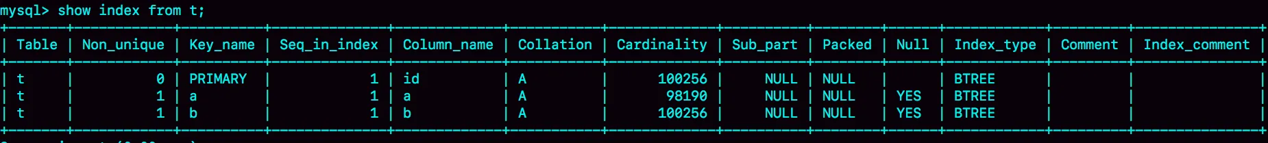 从结果上看,语句选择了索引a,也是情理之中。之后,在这张插入10万条数据的表中,再进行如下操作: