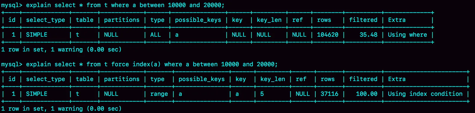 可以看到,Q1扫描了10万行,显然是走了全表扫描,执行时间是40毫秒。Q2扫描了10001行,执行了21毫秒。也就是说,我们在没有使用force index的时候,MySQL用错了索引,导致了更长的执行时间。