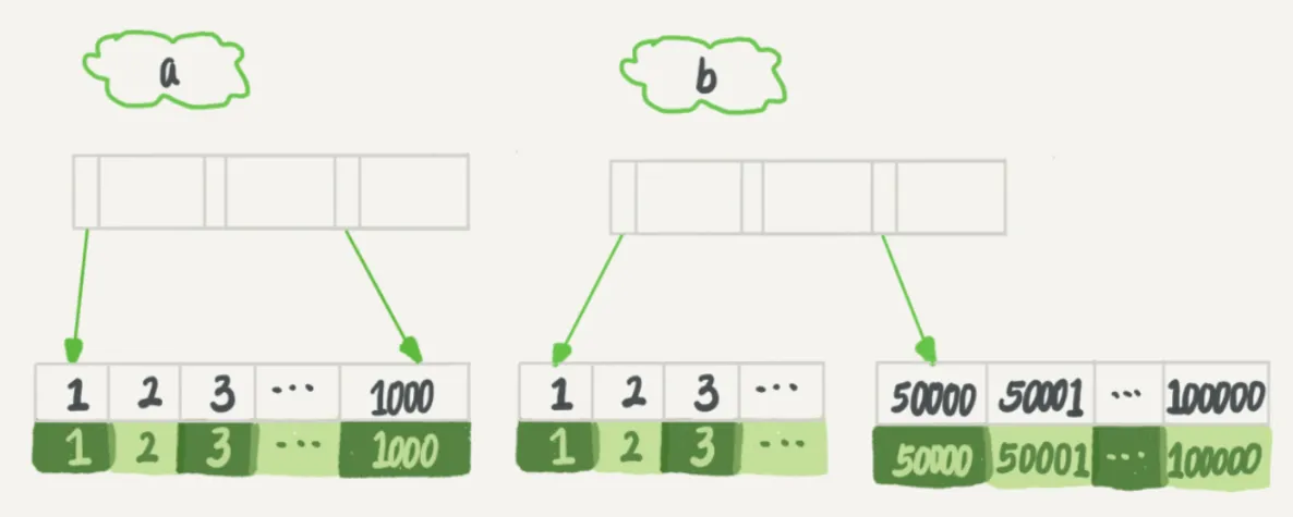 从条件上看,这条SQL语句没有符合条件的记录,会返回空集合。这里,a、b两个索引的结构图如下: