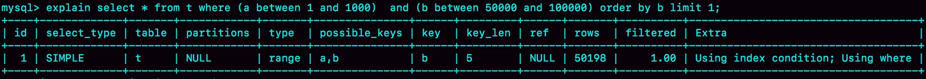 mysql> select * from t where (a between 1 and 1000) and (b between 50000 and 100000) order by b limit 1;